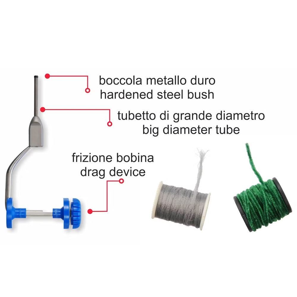 Bobinatore in acciaio inox ideale per la costruzione di grandi artificiali e streamers. Il suo tubetto di diametro maggiorato consente l’uso di filati voluminosi come floss, microciniglie etc. Munito di frizione per una precisa regolazione della tensione del filo. Adatto per bobine di varie dimensioni.