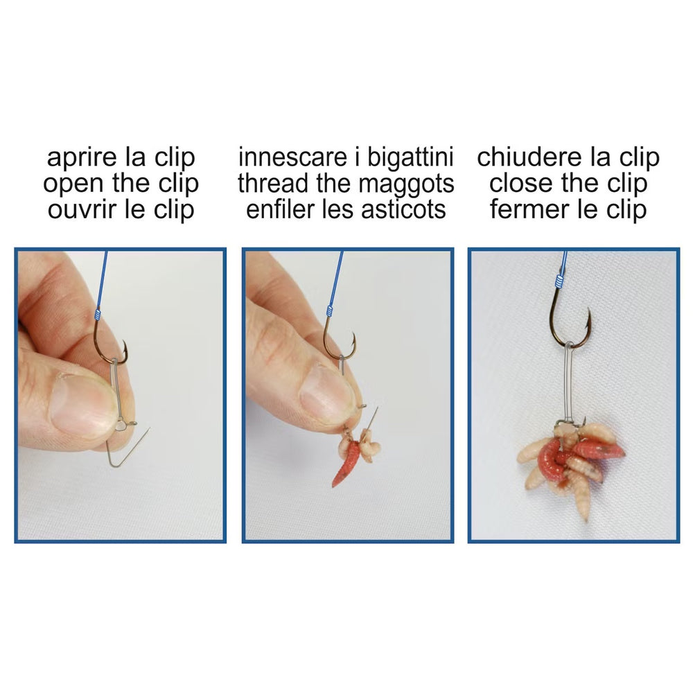 Queste piccole clip in acciaio inox permettono di innescare diversi bigattini per creare un boccone molto catturante. Il loro bloccaggio sul'amo avviene in modo molto semplice per mezzo di un piccolo elastico fornito in due diverse lunghezze.