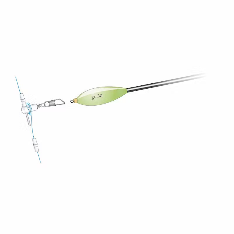 Fermagalleggianti del tipo fisso con girella e moschettone. Muniti di speciali tubetti di bloccaggio che assicurano una eccellente tenuta della posizione.