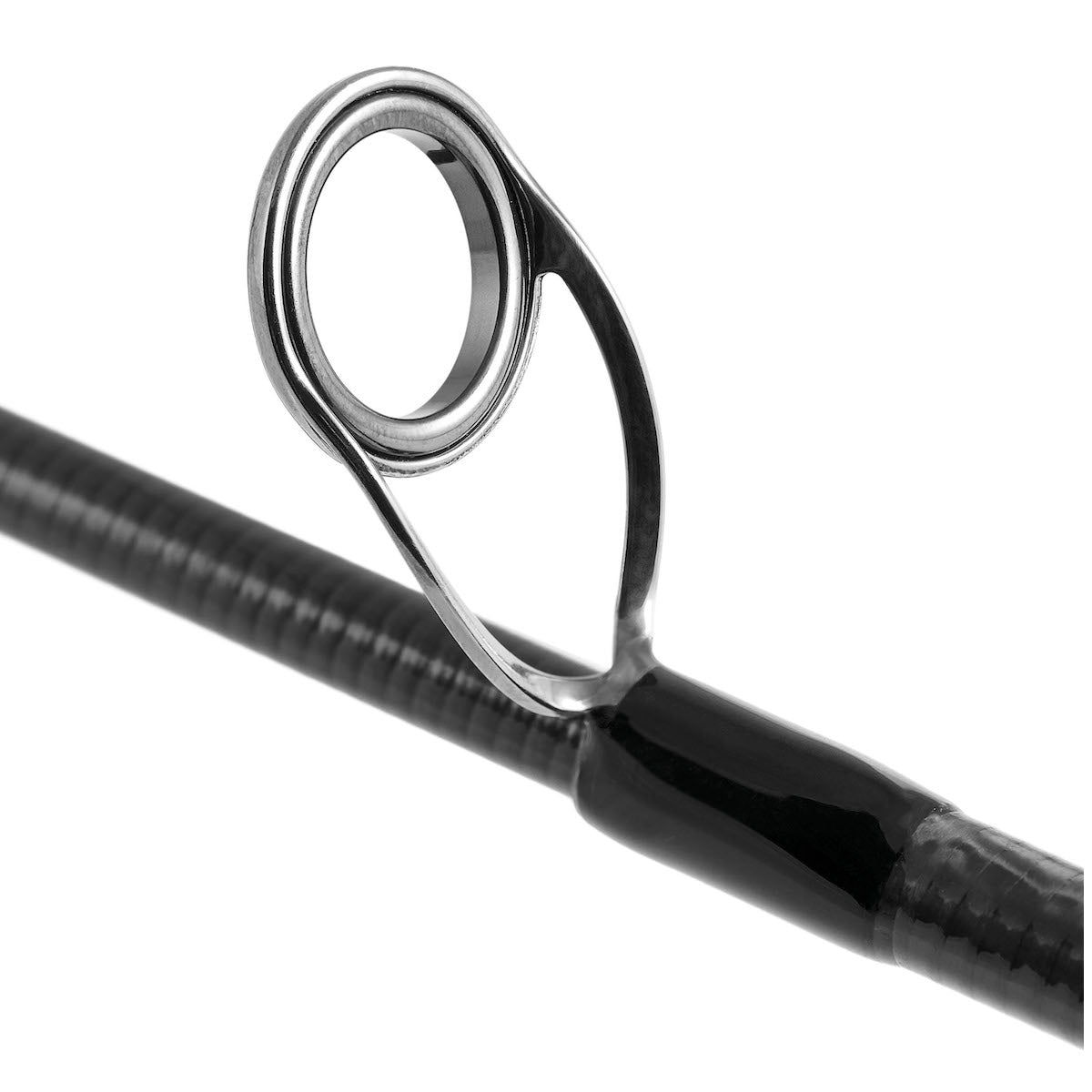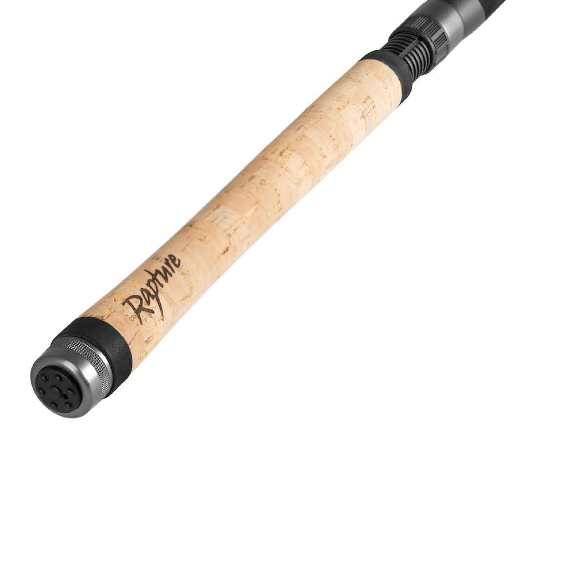 Manico in sughero naturale con tappo a vite in alluminio dotato di inserto in gomma ammortizzante. L’impugnatura in EVA ad alta densità integra un portamulinello a vite in grafite e acciaio estremamente stabile. Gli anelli K-SiC a gambo singolo con profilo anti-groviglio garantiscono scorrevolezza ottimale e ottime prestazioni anche con trecciati.
