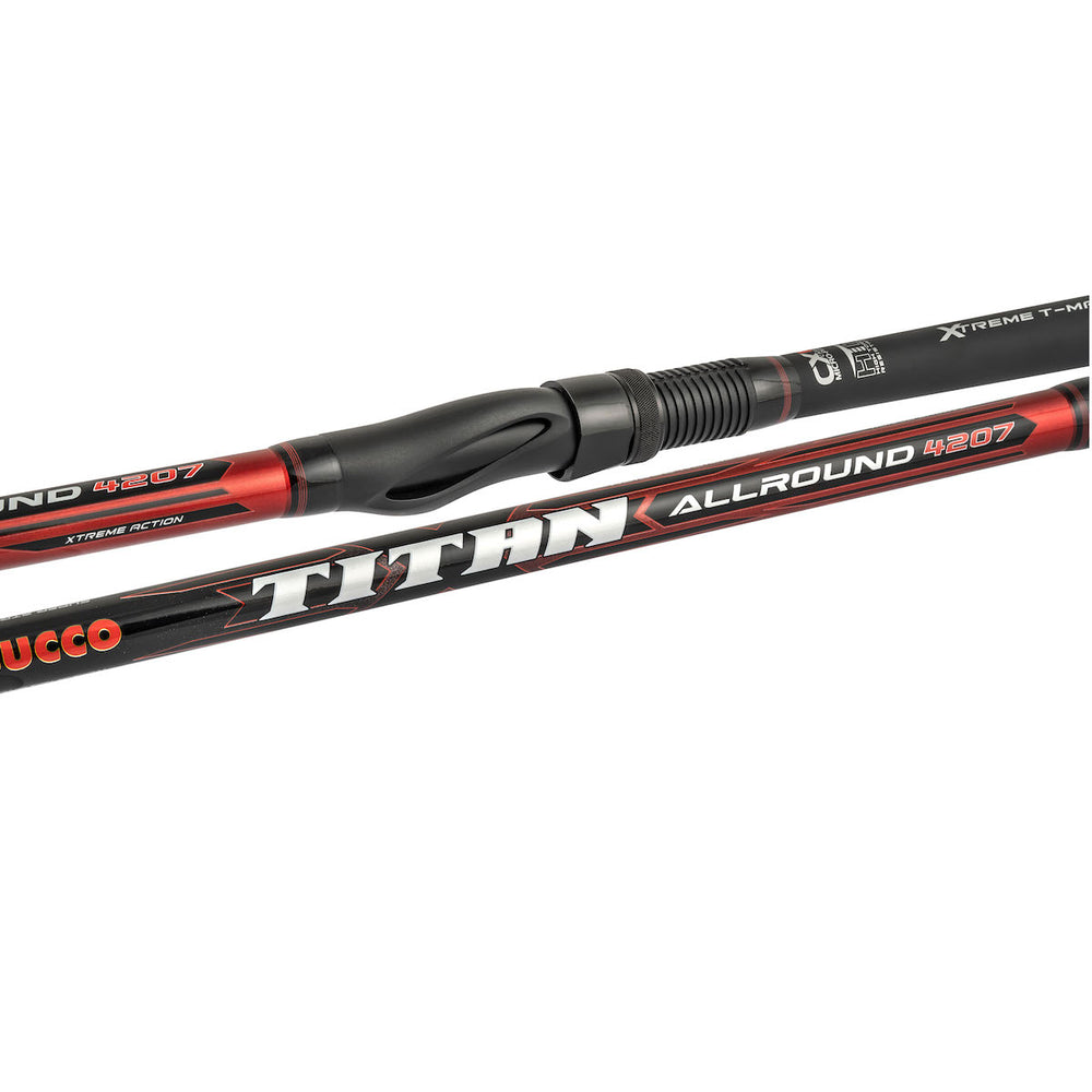 Canna Titan Allround con azione rapida, attendibilità elevata e ingombro ridotto. Placca in grafite con blocco e vite in acciaio per mulinello. Anelli Sea Guide resistenti alla ruggine, con pietra SIC e profilo “K”. Tappo inferiore in alluminio a filettatura interna.